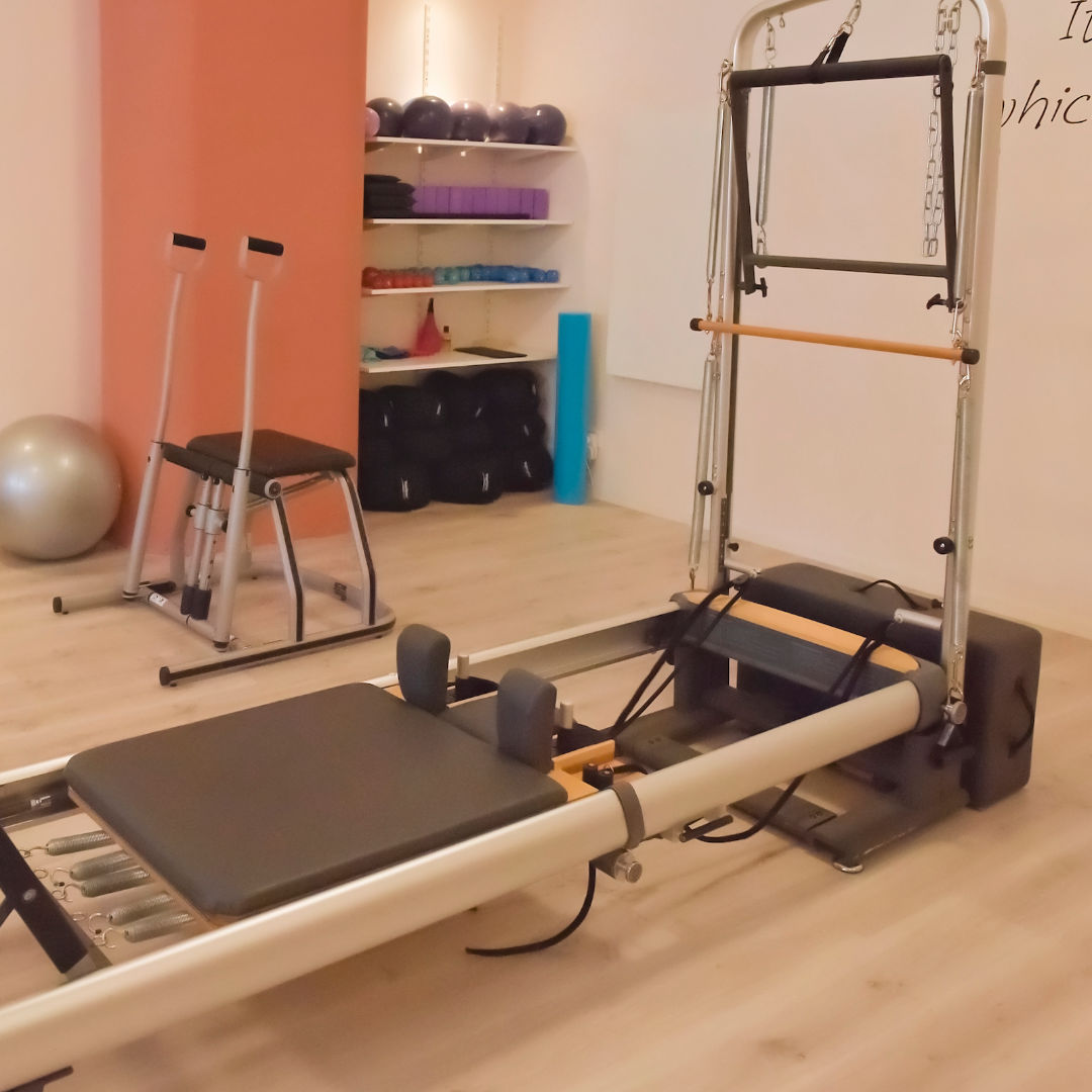 Reformer: Is a bed-like frame with a sliding carriage, springs which provide adjustable resistance, straps, and a footbar. Reformer Pilates is challenging for many reasons: the use of resistance, deeper core engagement, precision, and full-body involvement.